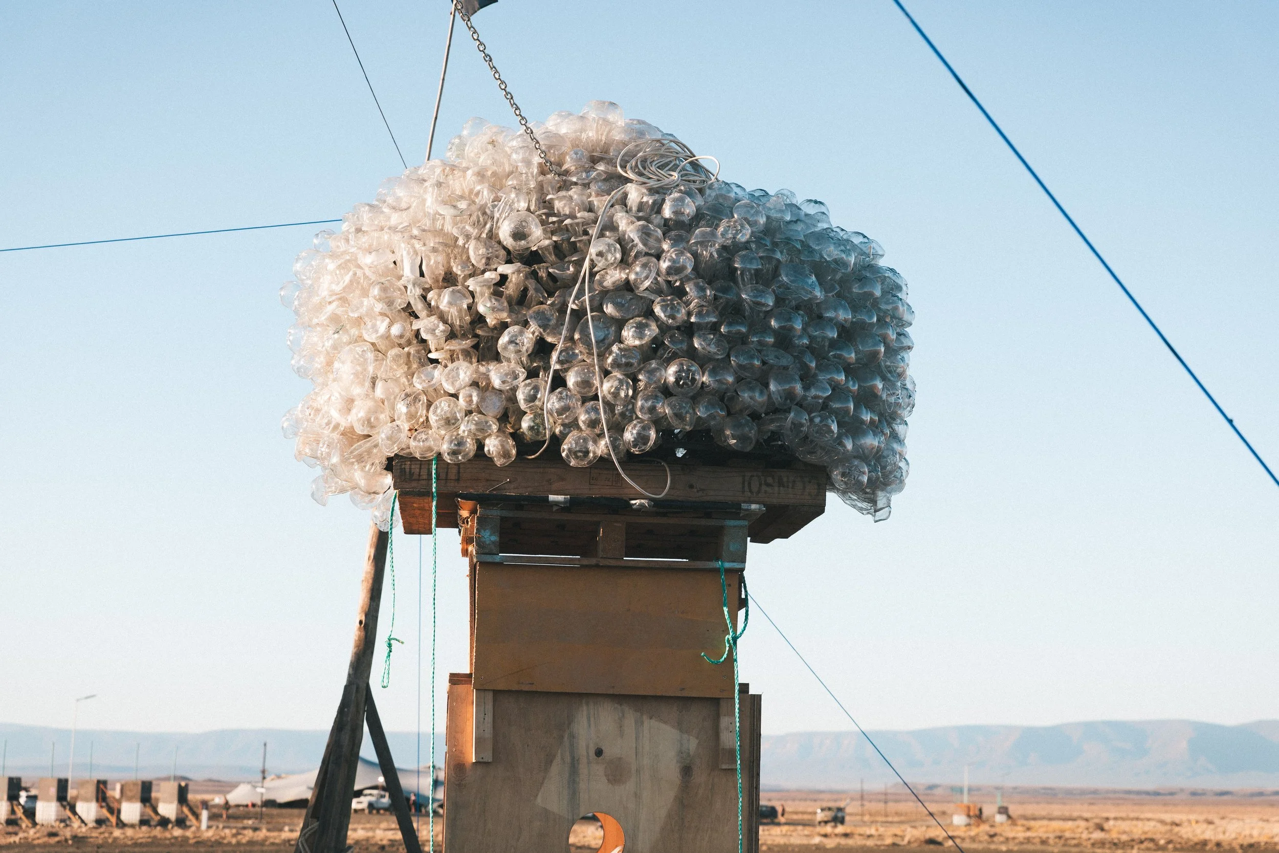In collaboration with artist Reece Brice, the jellyfish head was brought to life. I stumbled upon his work at Bazique, a music & art festival, and was mesmerized at first site. Plastic bottles had been shaped and formed into an illuminated mushroom garden. I was instantly hooked, and I knew that I wanted to get in touch with him. Reece immediately resonated with the project vision, and our collaboration brought the jellyfish head to life, using over 600 individually molded plastic bottles mounted on a frame crafted from reclaimed plastic crates.