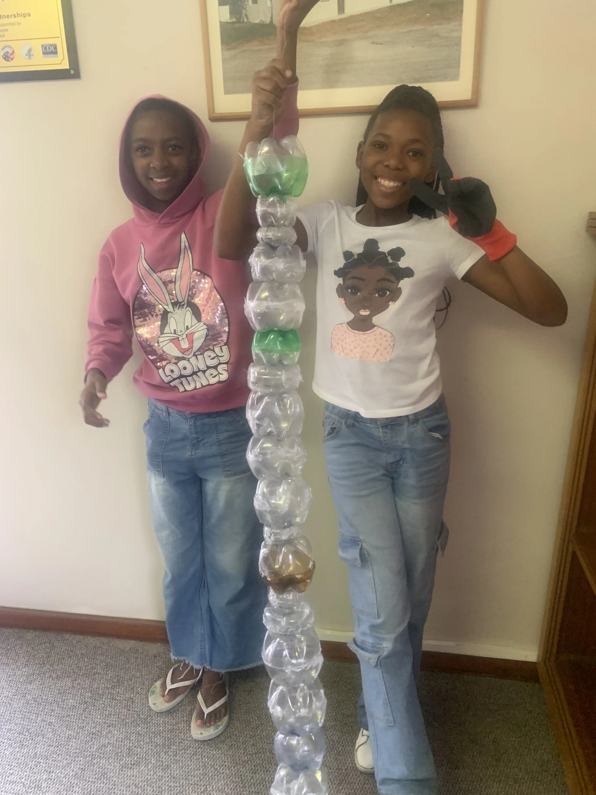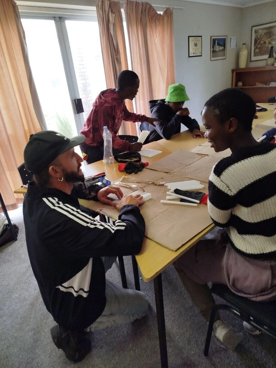 Each session began with a safety briefing, as participants would be working with box cutters and glue guns. Once briefed, the group got to work collecting and sorting plastic bottles—mostly 2-liter cooldrink bottles—gathered from the cleanup. These were then washed, dried, and primed for transformation. Before the crafting began, the design process was explained and illustrated so everyone understood how their efforts would contribute to the final jellyfish installation. From there, the bottles were cut, shaped, and assembled to form the flowing tentacles of the Cosmic Jelly. Some were connected with wire, others fused with heat or glued into place, showcasing how waste could be reimagined as something beautiful, functional, and full of meaning.