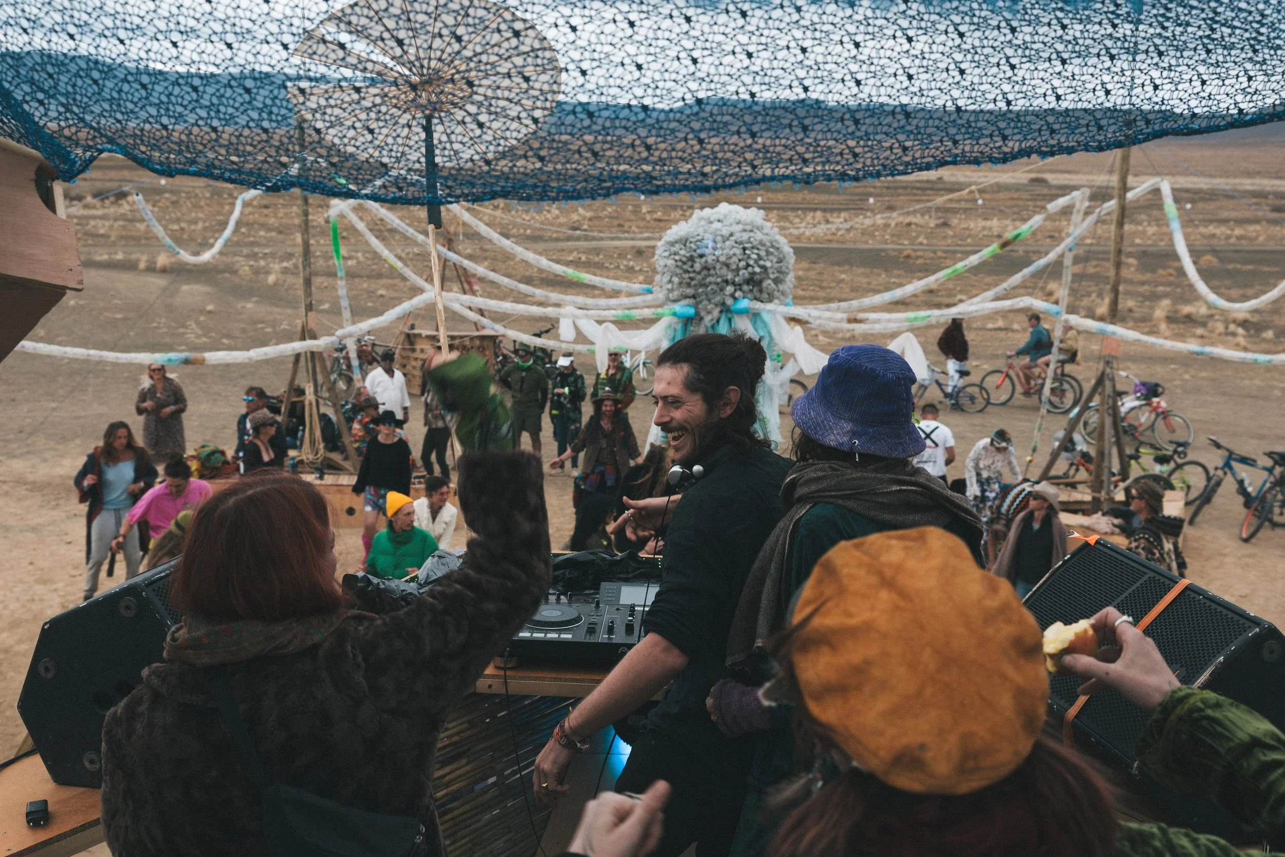 The Cosmic Jelly would not have been possible without the incredible support and collaboration of the 8doc crew. From the very beginning, they embraced the vision wholeheartedly and helped transform it into a living, glowing reality. Immense thanks go to every individual who played a part—whether in erecting the structure, decorating its flowing forms, or piecing it together through each step of the journey. Special gratitude also goes to the wider Afrikaburn community, whose generosity shone through in the donation of lights that brought the tentacles to life and the poles that were used to erect it. Together we are one!
